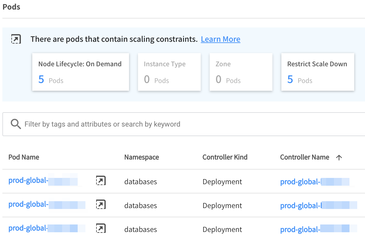 For a drill-down of more detail about the constraints on a specific pod, click on the Pod Name. In the pod details, you will see a list of scaling restrictions applied to that pod.