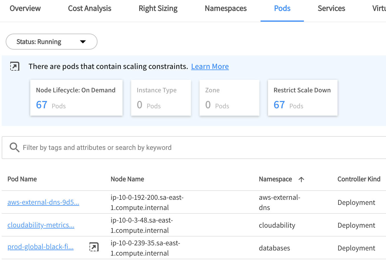 - When the Pods tab opens, a banner at the top indicates if there are constraints on the pods.